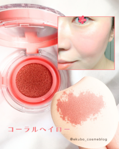 - コーラルヘイロー:日差しがお肌に降り注いだような、ライトピンキーコーラルカラー。私は頬の中央に濃いめに入れるのがお気に入り♡