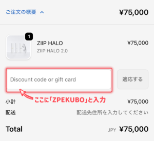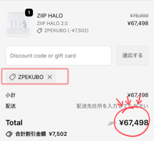 購入画面にある[Discount code or gift card]欄にZPEKUBOと入力して適用するだけ!